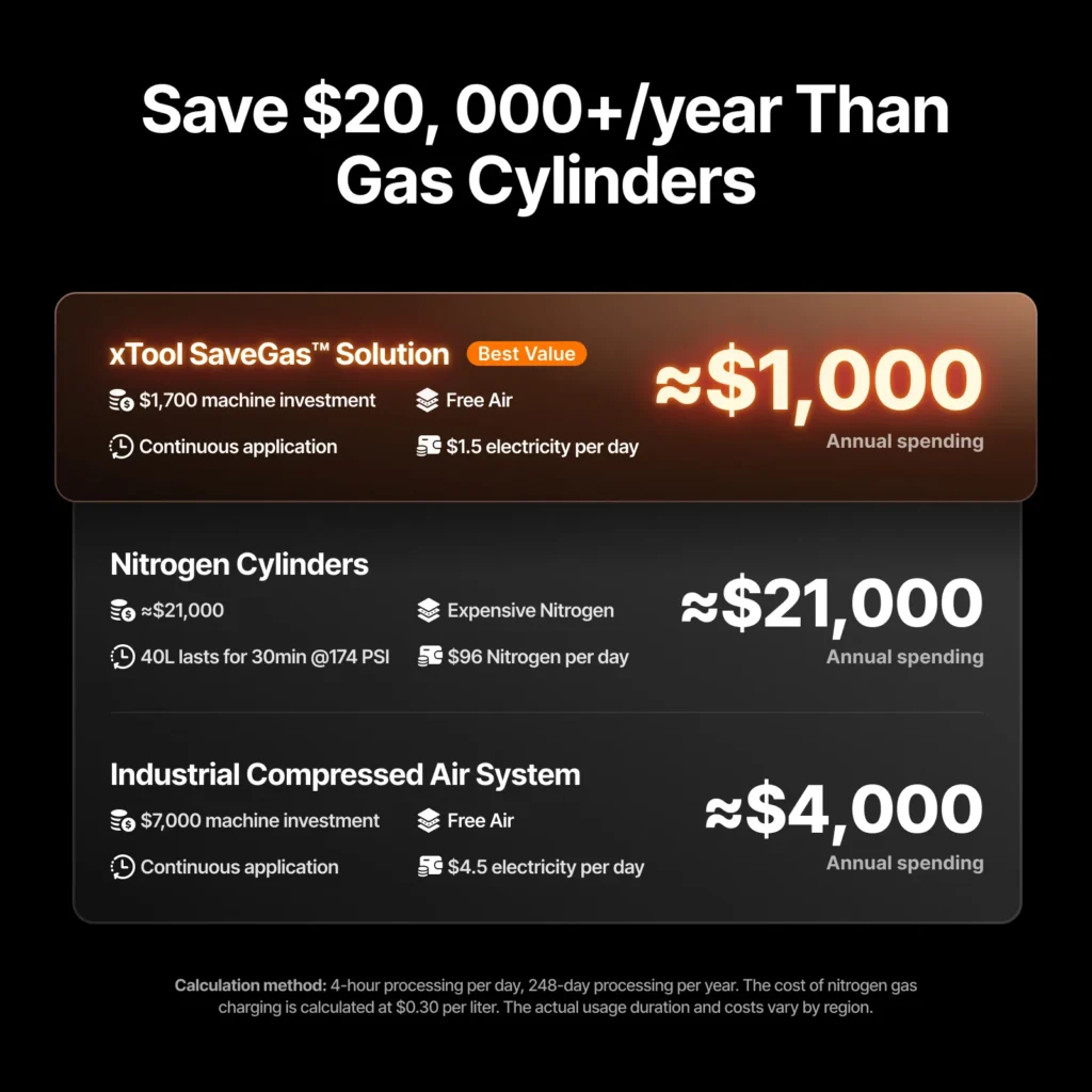With traditional setups, metal cutting often relies on nitrogen or argon gas tanks, which are both costly and inconvenient. These tanks require constant refilling, proper storage, and strict safety handling. Over time, the recurring expense of gas becomes one of the largest operating costs for workshops. The xTool air dryer eliminates this burden by allowing users to rely on clean, dry compressed air instead of bottled gases. This shift not only reduces expenses but also simplifies daily operations—no more waiting for refills, transporting heavy cylinders, or worrying about gas shortages. For small and medium-sized shops, it means freedom from recurring costs, greater independence, and a safer working environment. When calculated over a full year, the savings can easily reach thousands of dollars, while still ensuring burr-free, professional-quality cuts across different types of metal.